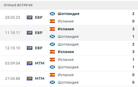 В предыдущих 5 встречах Испания выиграла 2 раза, а Шотландия – 1.