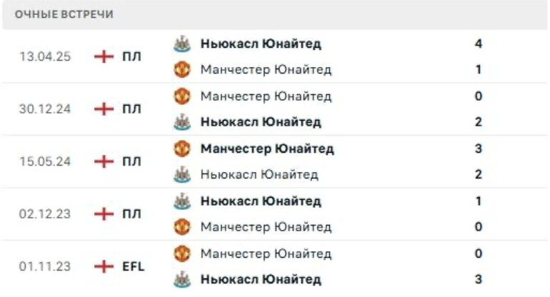В предыдущих 5 очных матчах Ньюкасл выиграл 4 раза, а Манчестер только 1 раз.