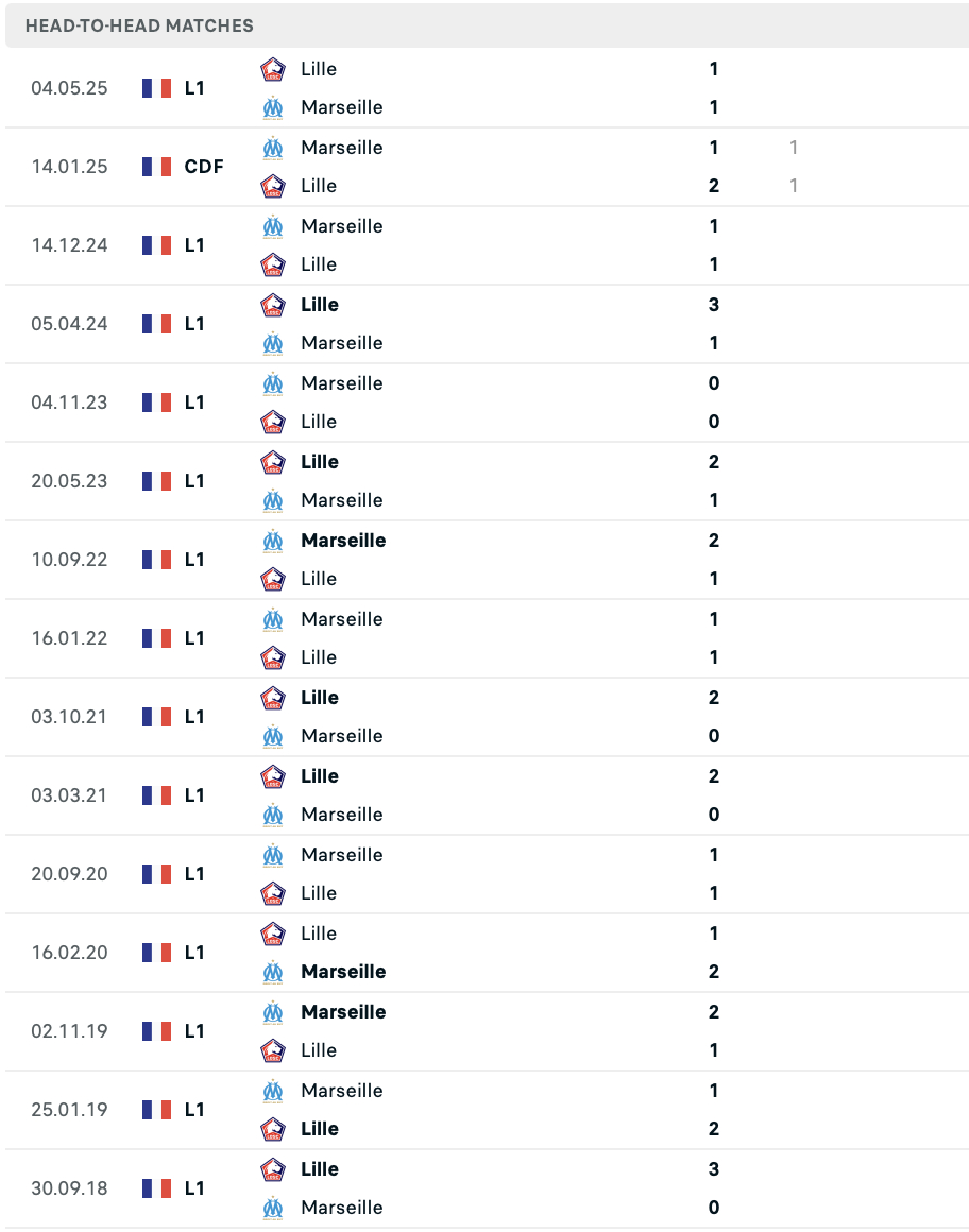 Последние очные встречи были за Лиллем – команда не проиграла в десяти из одиннадцати предыдущих матчей (5 побед, 5 ничьих). На своем поле Лилль выиграл четыре из пяти последних игр против Марселя в Лиге 1.