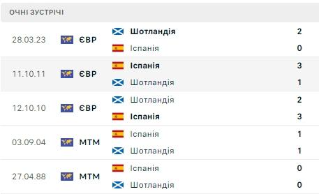 В попередніх 5 зустрічах Іспанія виграла 2 рази, а Шотландія 1.