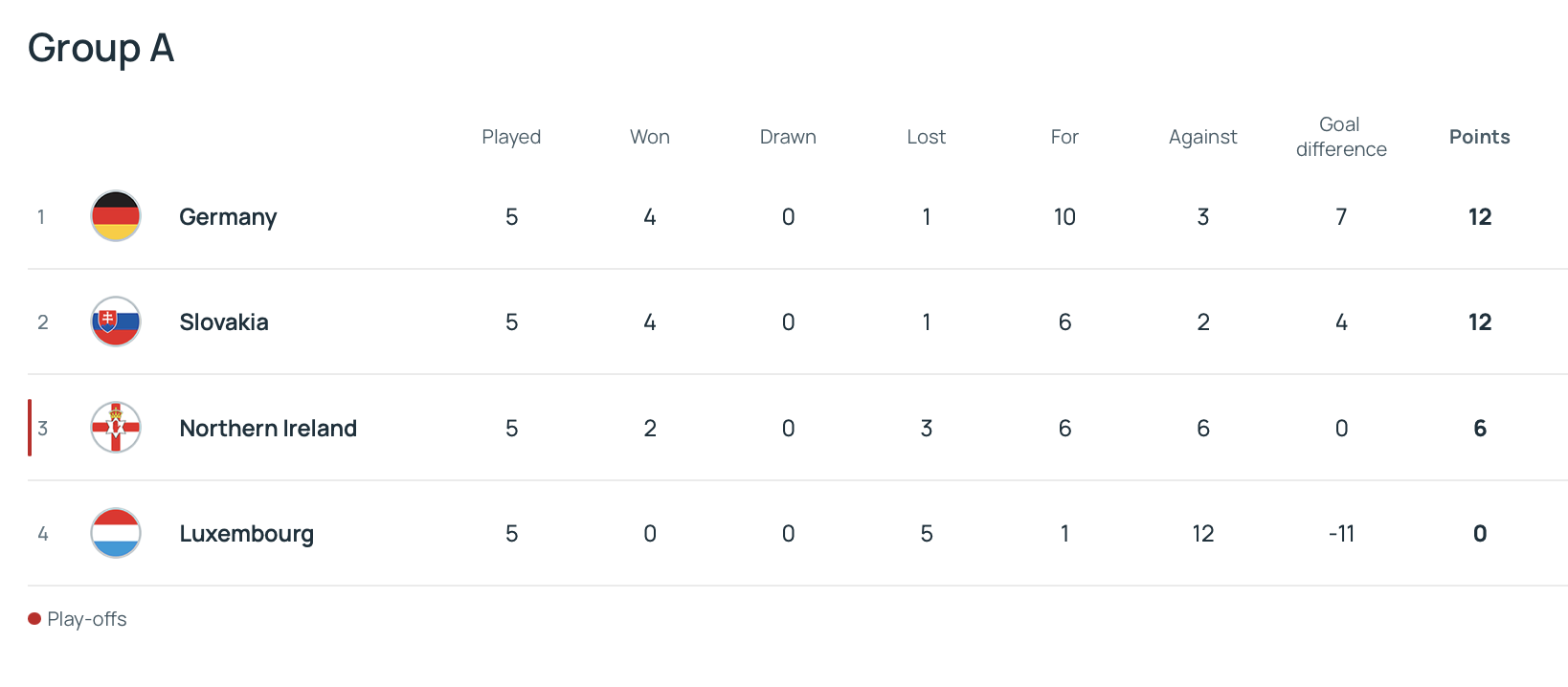 Словаччина, аби виграти групу, мусить брати лише перемогу – навіть попри свою історичну домашню звитягу над Німеччиною у вересні. Такий результат став би справжнім проривом: команда всього раз у своїй історії виходила на чемпіонат світу як незалежна збірна. Після мінімальної перемоги над Північною Ірландією 1:0 словаки зберігають шанси на успіх, але реалістичнішим виглядає варіант плей-оф. До того ж їхня виїздна статистика невтішна – п’ять поразок у шести останніх матчах на виїзді.
