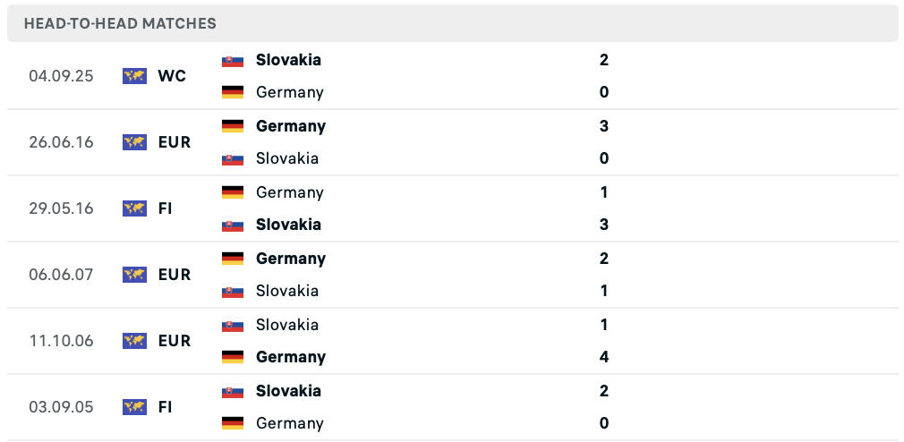 Вона говорить на користь Німеччини (8 перемог проти 4), але в останніх шести поєдинках команди поділили успіх порівну – по три перемоги. Більше того, саме Словаччина завдала Німеччині єдиної поразки у цьому відборі.