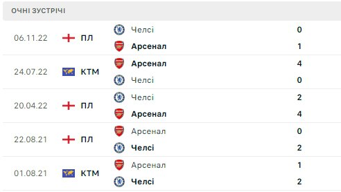 У минулому році суперники провели три зустрічі, і кожного разу перемагав «Арсенал», в тому числі й у першому колі з рахунком 1:0. А раніше «Челсі» переміг два рази. Ось баланс пʼяти останніх зустрічей команд з міста Лондон: