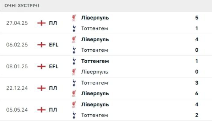 У попередніх 5 очних матчах Ліверпуль виграв 4 рази, а Тоттенгем – 1 раз. Причому всі перемоги ліверпульців були з різницею в 2 і більше голів.