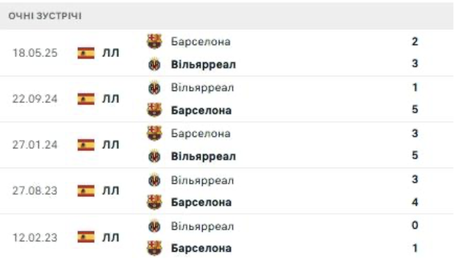 У попередніх 5 очних матчах Барселона виграла тричі, а Вільярреал – 2 рази.