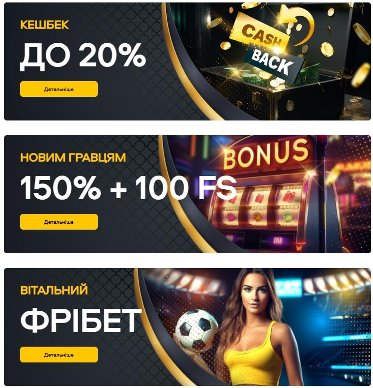 На даний момент у казино доступний вітальний бонус, а також фрібети та кешбеки у рамках Програми лояльності.