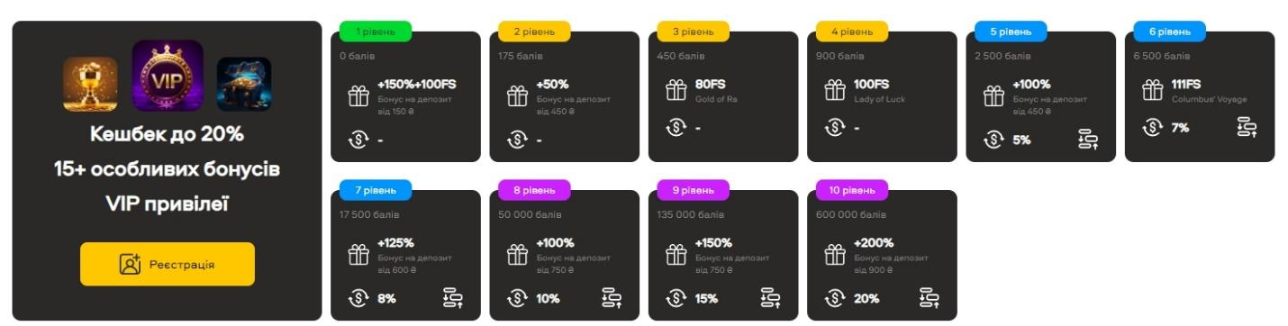 Для кожного рівня передбачено свій пакет бонусів: фріспіни, кешбеки, бонус на депозит та інші заохочення. Що рівень, тим більше призів. Звичайно, потрібно набрати більше очок для підвищення рівня.